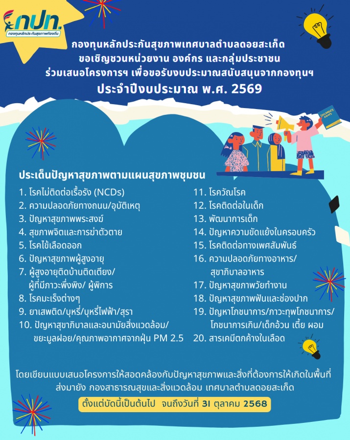 กองทุนหลักประกันสุขภาพเทศบาลตำบลดอยสะเก็ด ประชาสัมพันธ์เชิญชวนหน่วยงานหรือองค์กรและกลุ่มประชาชนในพื้นที่เทศบาลตำบลดอยสะเก็ด เสนอโครงการด้านสุขภาพที่สอดคล้องกับปัญหาสุขภาพตามแผนสุขภาพชุมชน เพื่อขอรับงบประมาณสนับสนุนจากกองทุนฯ ประจำปีงบประมาณ พ.ศ. 2569