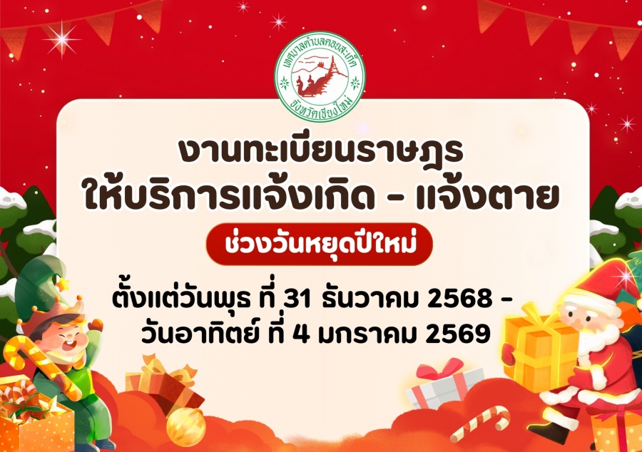 งานทะเบียนราษฎรเทศบาลตำบลดอยสะเก็ดประกาศวันหยุดทำการ ระหว่างวันที่ 31 ธันวาคม 2568 - 4 มกราคม 2569