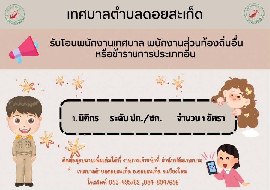 แจ้งประชาสัมพันธ์ เทศบาลตำบลดอยสะเก็ด รับโอนพนักงานเทศบาล พนักงานส่วนท้องถิ่นหรือข้าราชการประเภทอื่น