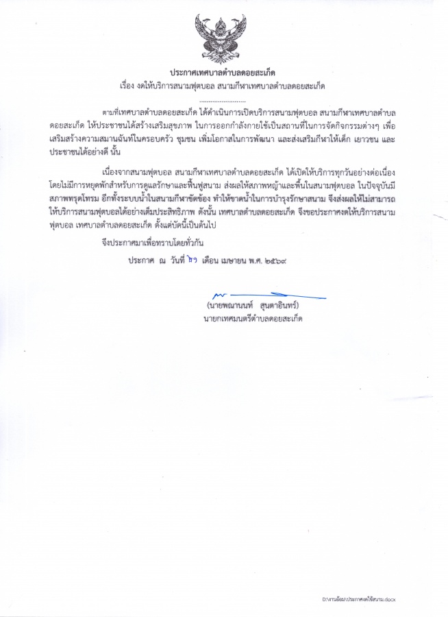 ประกาศเทศบาลตำบลดอยสะเก็ด เรื่อง งดให้บริการสนามฟุตบอล สนามกีฬาเทศบาลตำบลดอยสะเก็ด