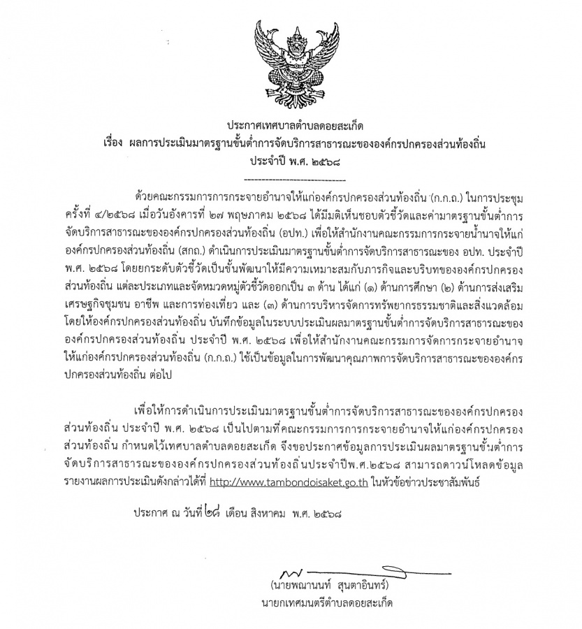 ผลการประเมินมาตรฐานขั้นต่ำการจัดบริการสาธารณะขององค์กรปกครองส่วนท้องถิ่น ประจำปี พ.ศ.2568