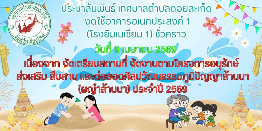 แจ้งประชาสัมพันธ์ เทศบาลตำบลดอยสะเก็ด จะได้ดำเนินการจัดงานตามโครงการอนุรักษ์ส่งเสริม สืบสาน และต่อยอดศิลปะวัฒนะวัฒนธรรมภูมิปัญญา ประจำปี 2569 จึงของดใช้อาคารอเนกประสงค์หนึ่ง ชั่วคราว ในวันพฤหัสบดีที่ 9 เมษายน 2569